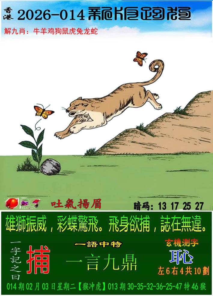 014期跑狗:【捕】雄獅振威,彩蝶驚飛。飛身欲捕,誌在無違。玄機測字:《恥》