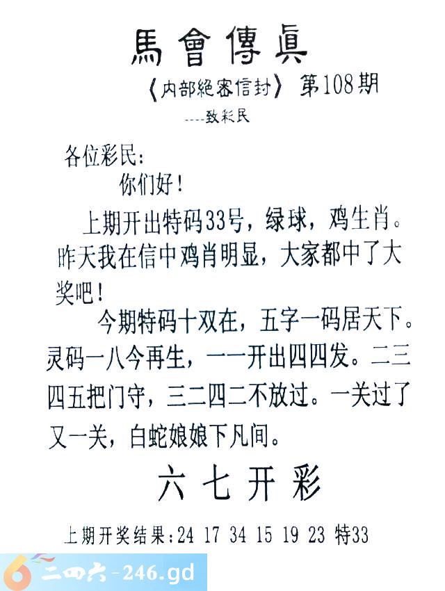 108期:首发推荐:≮馬會傳眞≯→(香港正版)