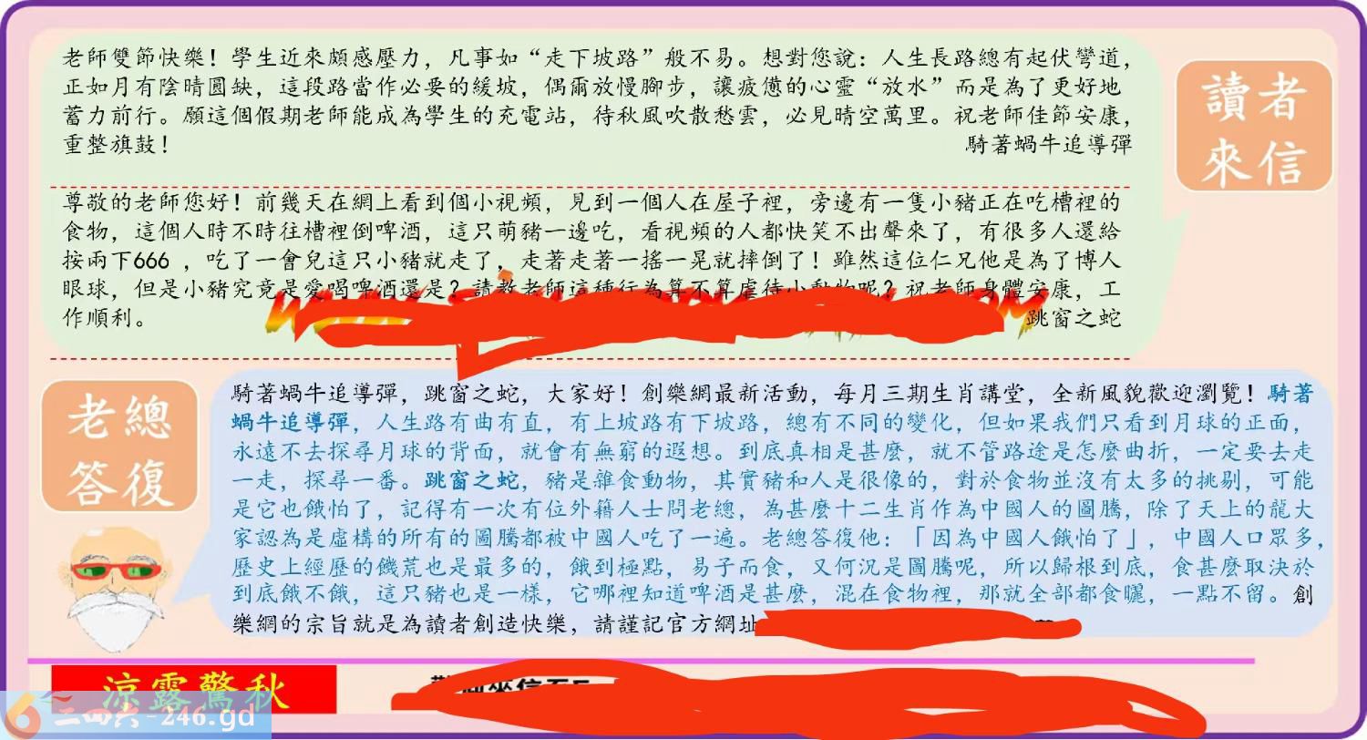 老師雙節快樂!學生近來頗感壓力,凡事如“走下坡路”般不易。想對您說:人生長路總有起伏彎道, 正如月有陰晴圆缺,這段路當作必要的緩坡,偶爾放慢腳步,讓疲憊的心靈“放水”而是為了更好地蓄力前行。願這個假期老師能成為學生的充電站,待秋風吹散愁雲,必見晴空萬里。祝老師佳節安康,騎著蝸牛追導彈 尊敬的老師您好!前幾天在網上看到個小視頻,見到一個人在屋子裡,旁邊有一隻小豬正在吃槽裡的食物,這個人時不時往槽裡倒啤酒,這只萌豬一邊吃,看視頻的人都快笑不出聲來了,有很多人還給按雨下666,吃了一會兒這只小豬就走了,走著走著一搖一晃就摔倒了!雖然這位仁兄他是為了博人 眼球,但是小豬究竟是爱喝啤酒還是祝康,工 作順利。跳窗之蛇 答復老總蝸牛追導彈,人生路有曲有直,有上坡路有下坡路,總有不同的變化,但如果我們只看到月球的正面,騎著蝸牛追導彈,跳窗之蛇,大家好!創樂網最新活動,每月三期生肖講堂,全新風貌歡迎瀏覽!騎著一走,探尋一番。跳窗之蛇,豬是雜食動物,其實豬和人是很像的,對於食物並沒有太多的挑剔,可能永遠不去探寻月球的背面,就會有無窮的遐想。到底真相是甚麼,就不管路途是怎麼曲折,一定要去走是它也餓怕了,記得有一次有位外籍人士問老總,為甚麼十二生肖作為中國人的圖騰,除了天上的龍大 家認為是虚構的所有的圖騰都被中國人吃了一遍。老總答復他:「因為中國人餓怕了」,中國人口眾多,歷史上經歷的饑荒也是最多的,餓到極點,易子而食,又何況是圖騰呢,所以歸根到底,食甚麼取決於到底餓不餓,這只豬也是一樣,它哪裡知道啤酒是甚麼,混在食物裡,那就全部都食曬,一點不留。創樂網的宗旨就是為讀者創造快樂