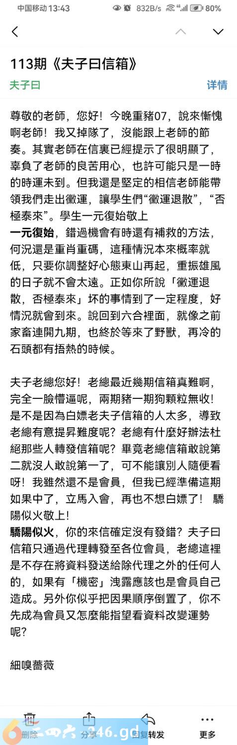 本帖最后由蒲公英于2025-10-2120:55编辑 1.尊敬的老師,您好!今晚重豬07,說來慚愧啊老師!我又掉隊了,沒能跟上老師的節奏。其實老師在信裏已經提示了很明顯了,辜負了老師的良苦用心,也許可能只是一時的時運未到。但我還是堅定的相信老師能帶領我們走出黴運,讓學生們“黴運退散”,“否極泰來”。學生一元復始敬上 〖一元復始〗錯過機會有時還有補救的方法,何況還是重肖重碼,這種情況本來概率就低,只要你調整好心態東山再起,重振雄風的日子就不會太遠。正如你所說「黴運退散,否極泰來」坏的事情到了一定程度,好情況就會到來。說回到六合裡面,就像之前家畜連開九期,也終於等來了野獸,再冷的石頭都有捂熱的時候。 2.夫子老總您好!老總最近幾期信箱真難啊,完全一臉懵逼呢,兩期豬一期狗顆粒無收!是不是因為白嫖老夫子信箱的人太多,導致老總有意提昇難度呢?老總有什麼好辦法杜絕那些人轉發信箱呢?畢竟老總信箱敢說第二就沒人敢說第一了,可不能讓別人隨便看呀!我雖然還不是會員,但我已經準備這期如果中了,立馬入會,再也不想白嫖了!驕陽似火敬上! 〖驕陽似火〗你的來信確定沒有發錯?夫子曰信箱只通過代理轉發至各位會員,老總這裡是不存在將資料發送給除代理之外的任何人的,如果有「機密」洩露應該也是會員自己造成。另外你似乎把因果順序倒置了,你不先成為會員又怎麼能指望看資料改變運勢呢? 細嗅薔薇