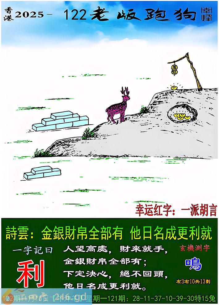122期老版跑狗一字記之曰:【利】 詩雲:金銀財帛全部有,他日名成更利就。
