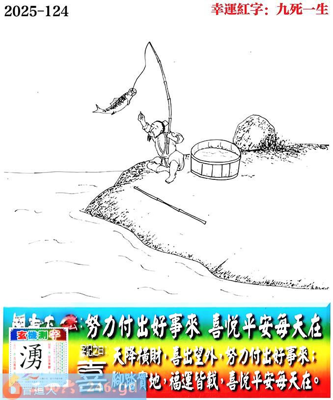 124期老版跑狗一字記之曰:【喜】 詩雲:努力付出好事來,喜悦平安每天在。 天降橫財,喜出望外,努力付出好事來; 腳踏實地,福運皆載,喜悦平安每天在。 玄機測字:《湧》