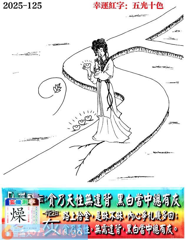 本帖最后由期望于2025-11-2207:53编辑 125期 125期老版跑狗一字記之曰:【灰】 詩雲:貪乃天性無違背,黑白當中總有灰。 路上拾金,是昧不昧,內心争札幾多回。 貪乃天性,無需違背,黑白當中總有灰。 玄機測字:《燥》
