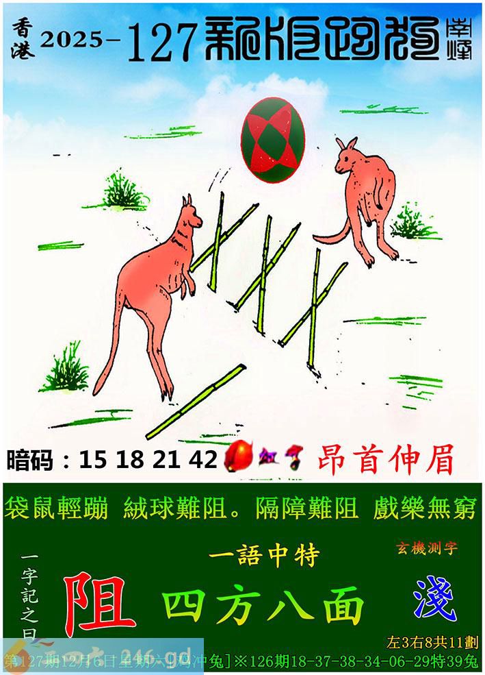 127期跑狗一字記之曰:【阻】 袋鼠輕蹦,絨球難阻。 隔障難阻,戲樂無窮。 玄機測字:《淺》 一語中特:四方八面