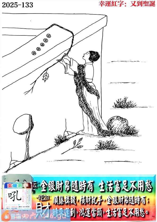 133期老版跑狗一字記之曰:【財】 詩雲:金銀財帛隨時有,生活富足不用愁。 順藤摸錢,橫財就手,金銀財帛隨時有; 時來運到,鴻運當頭,生活富足不用愁。 玄機測字:《吼》