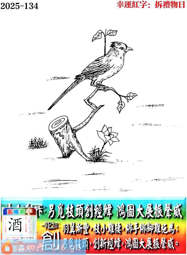 134期老版跑狗一字記之曰:【創】 詩雲:另覓枝頭創經緯,鴻圖大展振聲威。 羽翼漸豐,枝小難棲,綁手綁腳難施為; 另覓枝頭,創新經緯,鴻圖大展振聲威。 玄機測字:《酒》