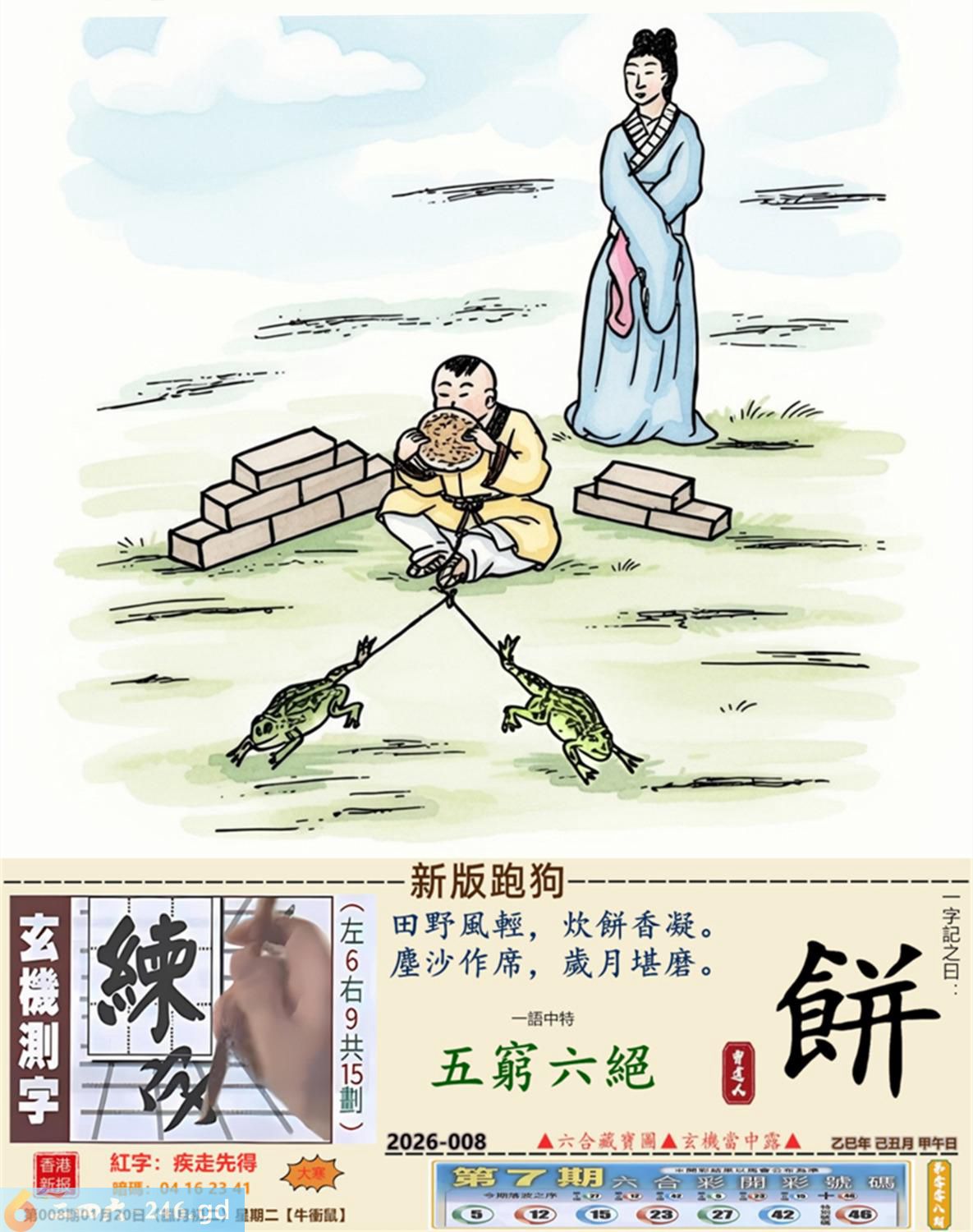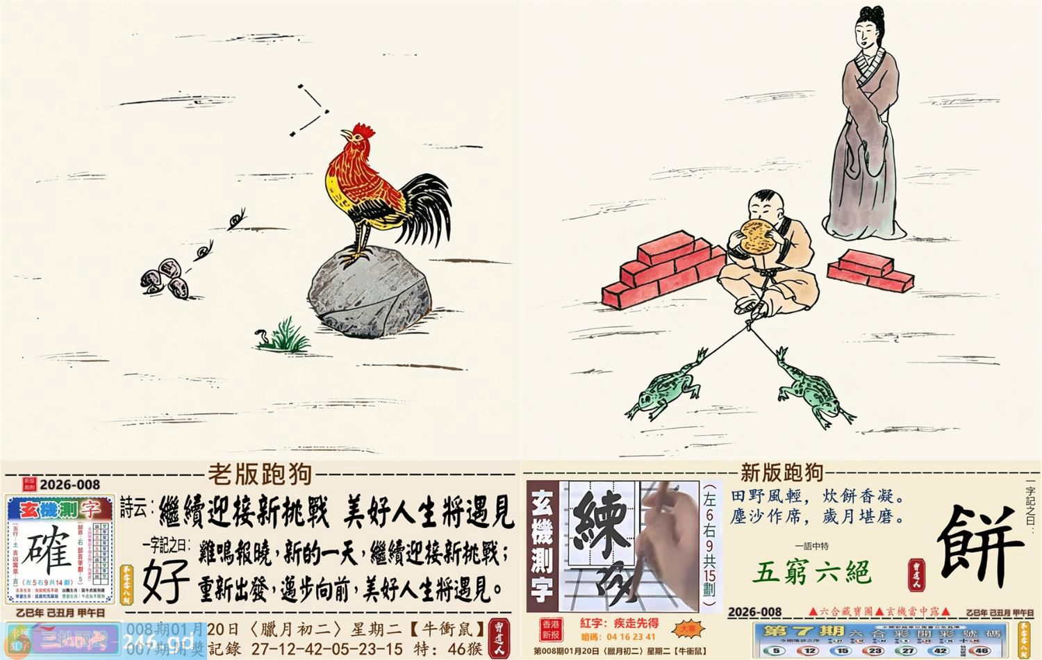 2026年1月20日008期鼠(戊子)(沙中金) 008期:老版跑狗玄機一字記之曰:【好】 詩云:繼續迎接新挑戰美好人生將遇見 雞鳴報曉,新的一天,繼續迎接新挑戰; 重新出發,邁步向前,美好人生將遇見。 玄機測字:《確》 密圖詩:小小意思買二十 《記》:大紅喜字我來剪 特碼大小單雙句:邁開雙大步走 今期必中:孫尚香 008期:特碼歇后語 豹子吃马鹿-----好大的胃口 008期正版四字梅花诗:背水一战。 008期火车头:烧伤鸡。诗:猴死猪伤,一落千咱万家屡。 008期香港第一手欲钱料:大开绿灯? 008期曾道人说:“再三再四?” 008期另版四字梅花诗:百年大计。 008期香港第一手欲钱料:欲钱看温柔的动物。 008期曾道人说:“为什么成功的男人事业为重”? 008期:二字經:休息 008期:今天是特码 008期:智力金壤;阳春白雪 008期:信箱紅字:【疾走先得】 008期:【暗碼:04-16-23-41】 008期:一語中特:【五窮六絕】 發財玄機圖:伸縮性强千姿百態圖中明蛇紅藍 008期:藏寳圖 新:清晓起来无个事 老:自说孤舟寒水畔 禁:牛禁:4尾玄機字《邦》 2026年008期【生活幽默】版 〖優待〗 機場登機櫃臺前,一位先生急匆匆擠上前問:"我是搭乘八點三十分的航班飛北京的,飛機起飛了没有?" 服務員答:"對不起,先生,飛機已經起飛了。" "可我是坐頭等艙的,就没有優待嗎?"這位先生還不死心。 機場服務員:"没有,先生。頭等艙和經濟艙是一起飛的。"