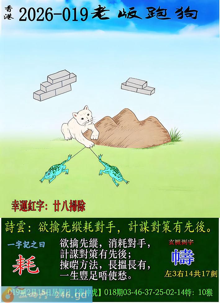 019期老版跑狗一字記之曰:【耗】 詩雲:欲擒先縱耗對手,計謀對策有先後。