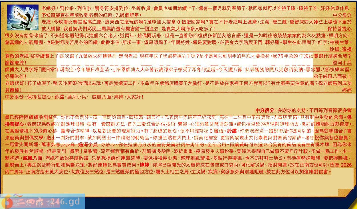 第020期《六合皇信箱文字版》10000%正確!!!正版二四六論壇*精心製作!!! 中分很分、保持菩提心、鈴鐺、過河小兵、威風八面、婷婷,大家好! 【1】.老總好!到位啦、到位啦、護身符安排到位,坐等收貨、會員也如期地續上了、還有一個月就到春節了、就回家就可以吃飽了睡、睡飽了吃,好好休息休息,不知道能否在年前收到老總的紅包、先過個肥年。中分很分 〖中分很分〗:多謝你的支持,不用等到春節很多會員已經陸陸續續收到紅包,你也不會例外。這一期開始轉肖、轉號碼、轉五行。代表丙午赤馬年已經來到,馬在十二生肖中象徵奔馳、力量與開拓,具有動中生財的含意。 【2】.老總,今晚看比赛差點高血壓,這東西怎麼玩的啊?足球被人掃拿0個蛋回家啊?實在不行老總叫上達摩,法海,唐三藏,魯智深四大護法上場也不至於被人横掃,我看換我們彩民上場興許還有機會射一個進去,是真氣人啊海參又吃多了!保持菩提心 〖保持菩提心〗:老總認為教練在選足球員時,要有一套篩選方法道先需要綜合評估技術、體能心理素質及戰術意識。邏包括卓越的控球與傅球能力、良好的體能耐力與速度。在高壓環境下的冷靜心態、團隊合作精神,以及對比赛的理解能力。有了起碼的基礎,便不用經常吃0難蛋。 【3】.很久沒有給您來信了,不知道您還記得我這個六合老人,近兩年,雖偶爾玩彩,但是一直看您回復很多新朋友的言語,還是一如既往的兢兢業業的為六友點燈,照明方向。創富網的人氣爆棚,也是對您良苦用心的回饋。此番來信,所求一事。望恩師賜予。年關將近,還是要對聯,必漫金大字貼與正門,轉好運。學生在此拜謝了。紅字:枯樹生華。鈴鐺:敬禮 〖鈴鐺〗:你要老總送一幅對聯給你是可以的,因為對聯結合了書法藝術與對偶文學,送出一副好的對聯,就如同送出一件雅經的藝術品。你漫金貼在大門上,能美化居室,更能夠展現出文化素養與對審美的期許。老總祝你與各位會員:一馬當先開新運,萬事如意步步高。 【4】.尊敬的老總,終於續費上了這次選了九紫離灭符轉轉運,想問老總,現在年底了我選符選對了嗎?是不是可以到明年的年底才要換符。我75年免的下次續费選什麼適合我?謝謝老總!過河小兵 〖過河小兵〗:你放心,你在這個月分求的靈符是屬於丙午馬年的,全年合用。再續费時可以選六合狗肖的飾品或者生肖桃木牌,因為你來年的發展雖然順暢,但是受到「貫索」星影響,流年運程稍有曲折,前路頗多險阻,波折重重,極易發生人事紛爭,要時常提醒自己做事不要斤斤計較,多做一點工作,少一點抱怨。 【5】.師傅大人見字好「臘日常年暖尚遥,今年臘田凍全消...」感恩師傅大人辛苦教誨讓弟子感受了寒冬的溫暖。今天瞻八飾,熱氣騰腾騰的臘八粥敬請笑納。願您臘八節快樂幸福,好運常伴!弟子威風八面敬上 〖威風八面〗:老總不敢説甚麼教誨,只是想提醒你運氣背時,要保持積極心態、整理雜亂環境、多點行善積德,也不妨拜拜土地公。而待運勢逆轉時,要把握時機、趁勢而上。專注於及時行動和果斷決策,將好運轉化為實質成果。 【6】.老師您好!孩子放假了,整天吵著带他們出去玩。可是我還要工作,本命年在紫飾店購買了太歲符,是不是放在家裡正南方就可以?有什麼需要注意的嗎?祝老師馬到成功身體棒!婷婷 〖婷婷〗:你將已經開光的太歲符放在包包或口袋內,可化解災禍、招財開運。放在正南方也可以,因為2026丙午馬年,正南方是五黄大病位、太歲位及三煞位,是三煞匯聚的極凶方位,屬火土相生之局,主災禍、疾病、突發意外與財運阻礙。放在此方位可以加強應對侵害。 紅字:攀炎附熱 暗码:21354146 [释义]比喻依附权贵势力。