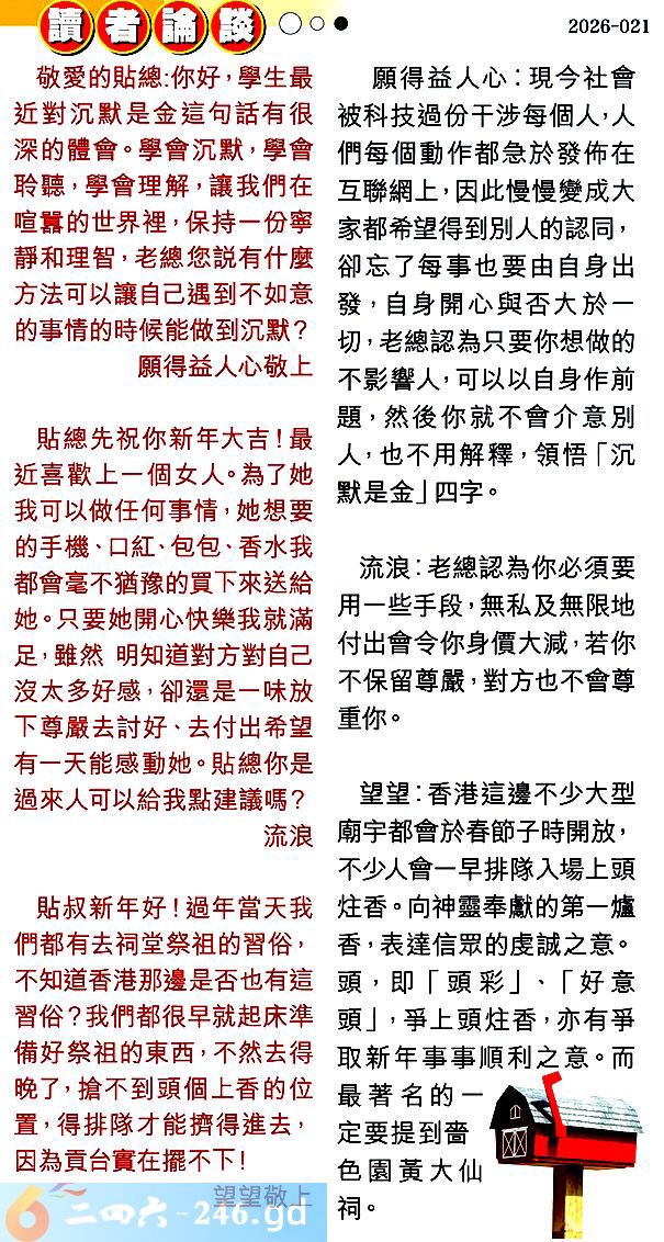 1.敬愛的貼總:你好,學生最近對沉默是金這句話有很深的體會。學會沉默,學會聆聽,學會理解,讓我們在喧嚣的世界裡,保持一份寧靜和理智,老總您説有什麼方法可以讓自己遇到不如意的事情的時候能做到沉默?願得益人心敬上
