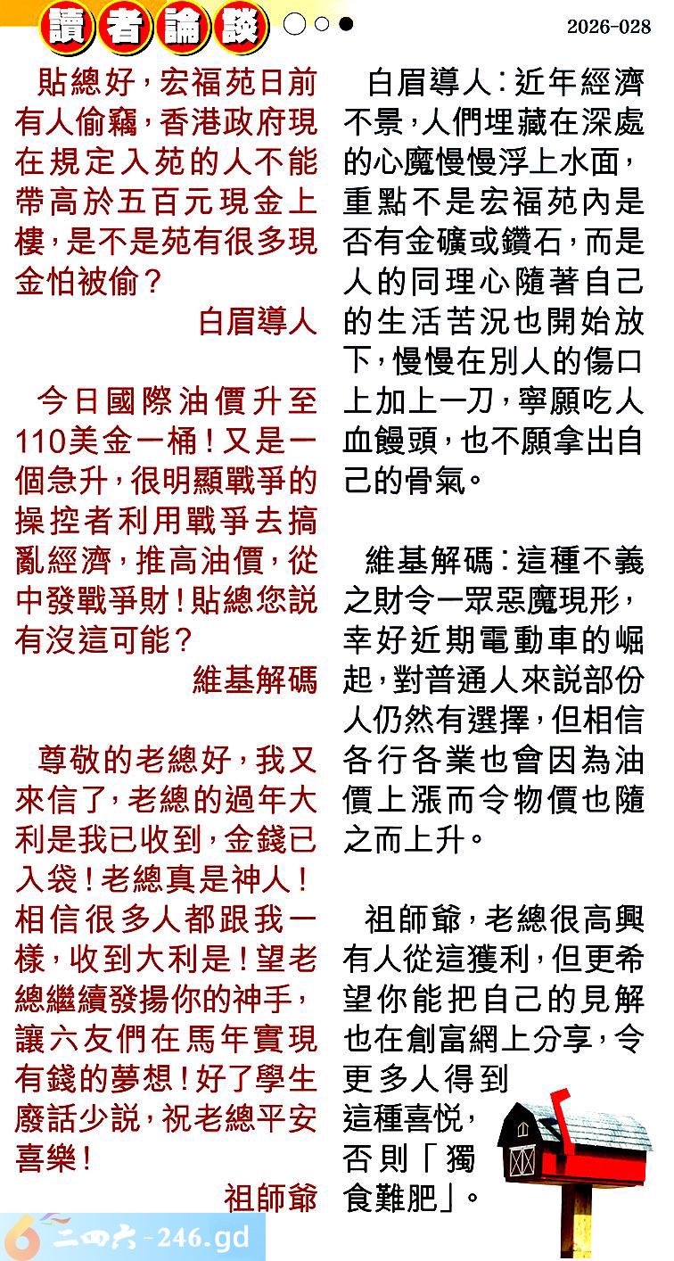第028期讀者論談 1.貼總好,宏福苑日前有人偷竊,香港政府現在規定入苑的人不能帶高於五百元現金上樓,是不是苑有很多現金怕被偷?白眉導人 〖白眉導人〗:近年經濟不景,人們埋藏在深處的心魔慢慢浮上水面,重點不是宏福苑內是否有金礦或鑽石,而是人的同理心隨著自己的生活苦況也開始放下,慢慢在別人的傷口上加上一刀,寧願吃人血饅頭,也不願拿出自己的骨氣。 2.今日國際油價升至110美金一桶!又是一個急升,很明顯戰爭的操控者利用戰爭去搞亂經濟,推高油價,從中發戰爭財!貼總您説有沒這可能?維基解碼 〖維基解碼〗:這種不義之財令一眾惡魔現形,幸好近期電動車的崛起,對普通人來説部份人仍然有選擇,但相信各行各業也會因為油價上漲而令物價也隨之而上升。 3.尊敬的老總好,我又來信了,老總的過年大利是我已收到,金錢已入袋!老總真是神人!相信很多人都跟我一樣,收到大利是!望老總繼續發揚你的神手,讓六友們在馬年實現有錢的夢想!好了學生廢話少説,祝老總平安喜樂!祖師爺 〖祖師爺〗:老總很高興有人從這獲利,但更希望你能把自己的見解也在創富網上分享,令更多人得到這種喜悦,否則「獨食難肥」。