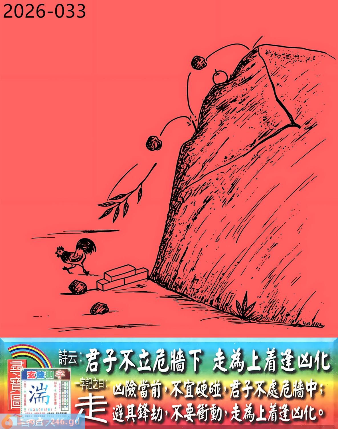 3月26日星期四平地木豬日沖蛇 033期:老版跑狗玄機一字記之曰:【走】 詩云:君子不立危牆下,走為上招逢凶化。 凶險當前,不宜硬碰,君子不立危牆下; 避其鋒劫,不要沖動,走為上招逢凶化。 玄機測字:《湍》 密圖詩:方圓十里無客棧 記:一八相伴漏紅珠 特碼大小單雙句:長話短說 今期必中:關羽 033期:特碼歇后語 秦始皇修长城-----功过后人评 033期正版四字梅花诗:炊沙成饭。 033期火车头:烧伤龙。诗:蛇死猪伤,马到边尾看其数。 033期香港第一手欲钱料:水? 033期曾道人说:“三人?” 033期另版四字梅花诗:青山绿水。 033期香港第一手欲钱料:欲钱看跑得快的生肖。 033期曾道人说:“为什么初恋的情人总比较难忘”? 033期:二字经:绿蓝。 033期:恐龙是特码 033期智力金壤:功败垂成 033期紅字:【觸手可及】 033期暗码:【02141845】 033期一語中特:【三頭六臂】 發財玄機圖:持笛吹奏席地而坐圖中明蛇紅藍 033期:藏寶圖 新:竹移不问醉与迷 老:惹窗映竹满炉烟 禁:蛇禁:8尾玄機字《要》 2026年033期【生活幽默】版 〖出軌〗 小麗嫁给了富二代。不久後富二代出軌了,而且臭名遠揚。小麗十分生氣,質問老公:“真没有看出你是侗流男,怪我瞎了眼!” 富二代很平静:“我這一切都是為你啊!”小麗:“為我?" 富二代十分認真:“你長相雖好、可智商平庸,又没有什麼什麼特殊才能,祗因貪戀富贵嫁到我家裹,别人一直在背後戳你脊梁骨,説你道德不端,在家裹你也根本没有地位,對吧!現在我出軌成了渣男,你翻身了!”